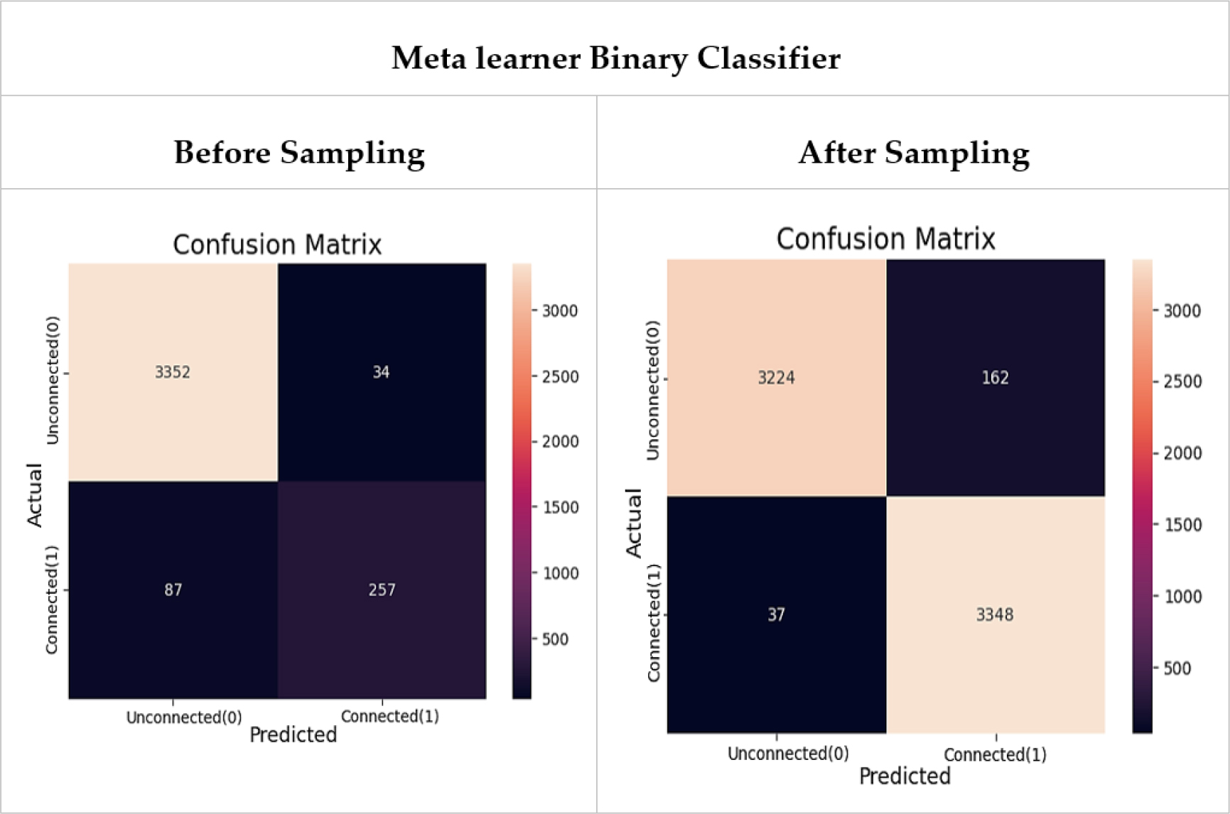 Confusion matrix of Meta-Learner Binary Classifier: Comparison of Performance Before and After Sampling.